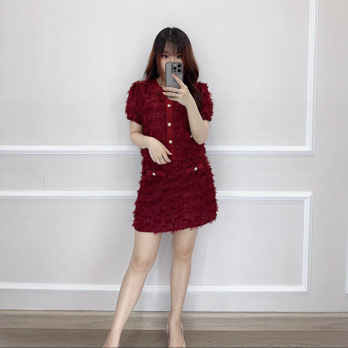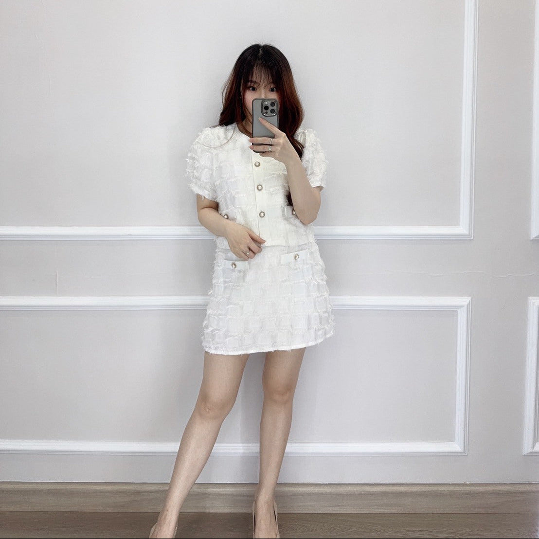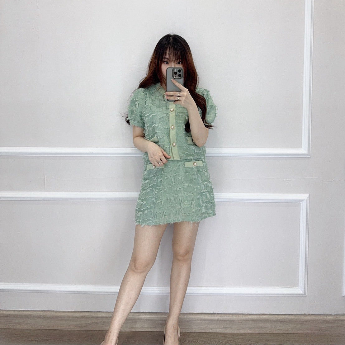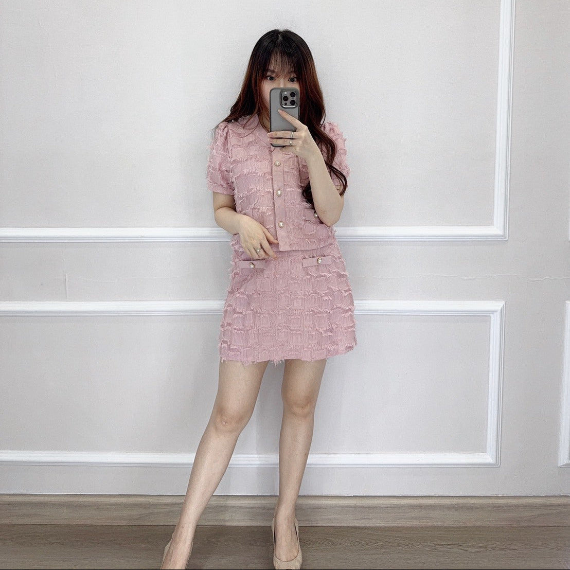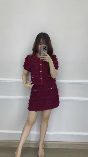 Features: Set dua piece berbahan furry cotton polyester dengan tekstur lembut dan tampilan eksklusif. Atasan kancing hidup dipadukan dengan rok celana yang nyaman, membuatnya ideal untuk gaya chic dan modern di berbagai kesempatan.