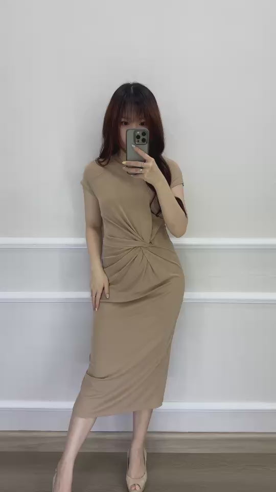 Features: Dress berbahan knitted stretch halus yang elastis, nyaman, dan mengikuti bentuk tubuh. Desain knot di bagian depan memberikan aksen modern dan menambah kesan ramping pada siluet. Cocok dipakai untuk acara semi-formal maupun casual chic.
