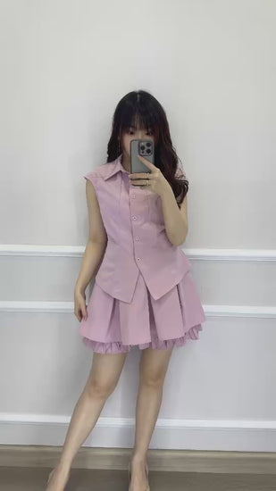 Set atasan dengan kancing hidup dan tali samping, dipadukan dengan skort yang nyaman (samping sleting, belakang karet). Memberikan tampilan preppy yang manis dan clean untuk daily look.