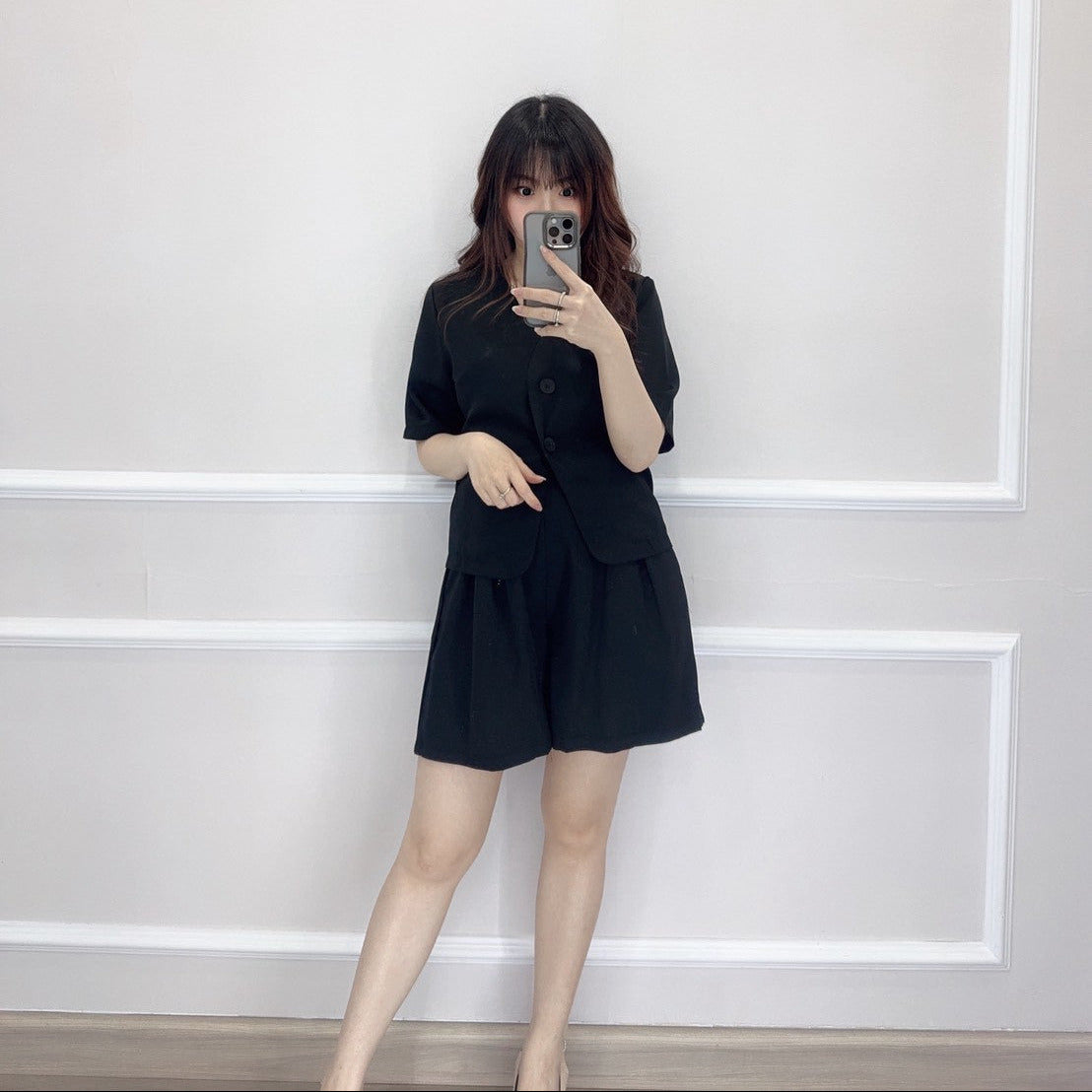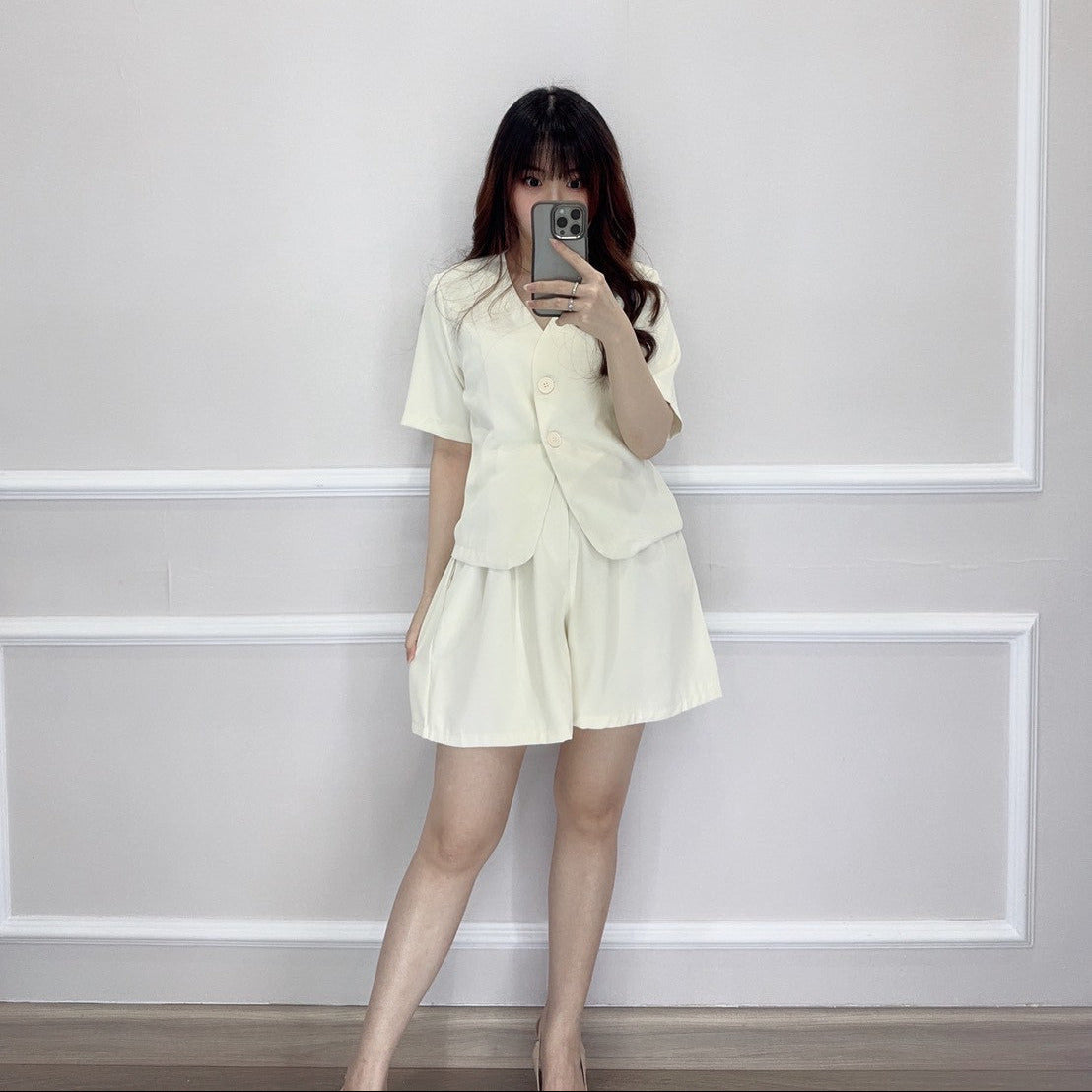 Set atasan kancing hidup dengan celana depan sleting dan kancing. Bahan cotton twill yang nyaman dan jatuh, cocok untuk tampilan chic dan casual.