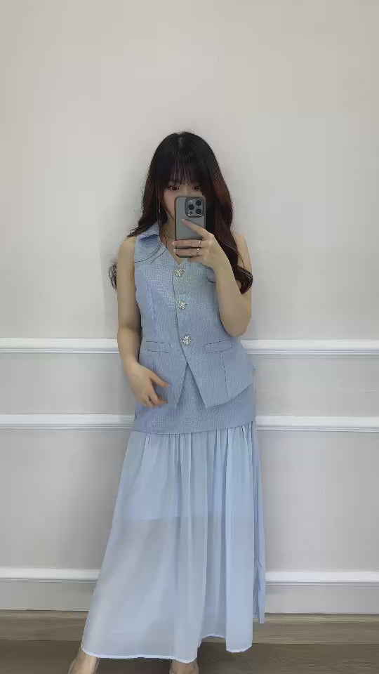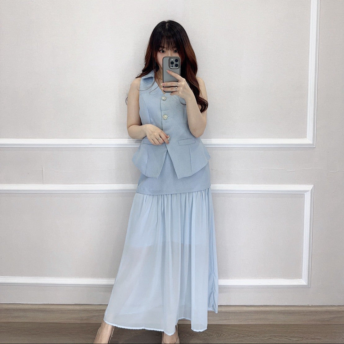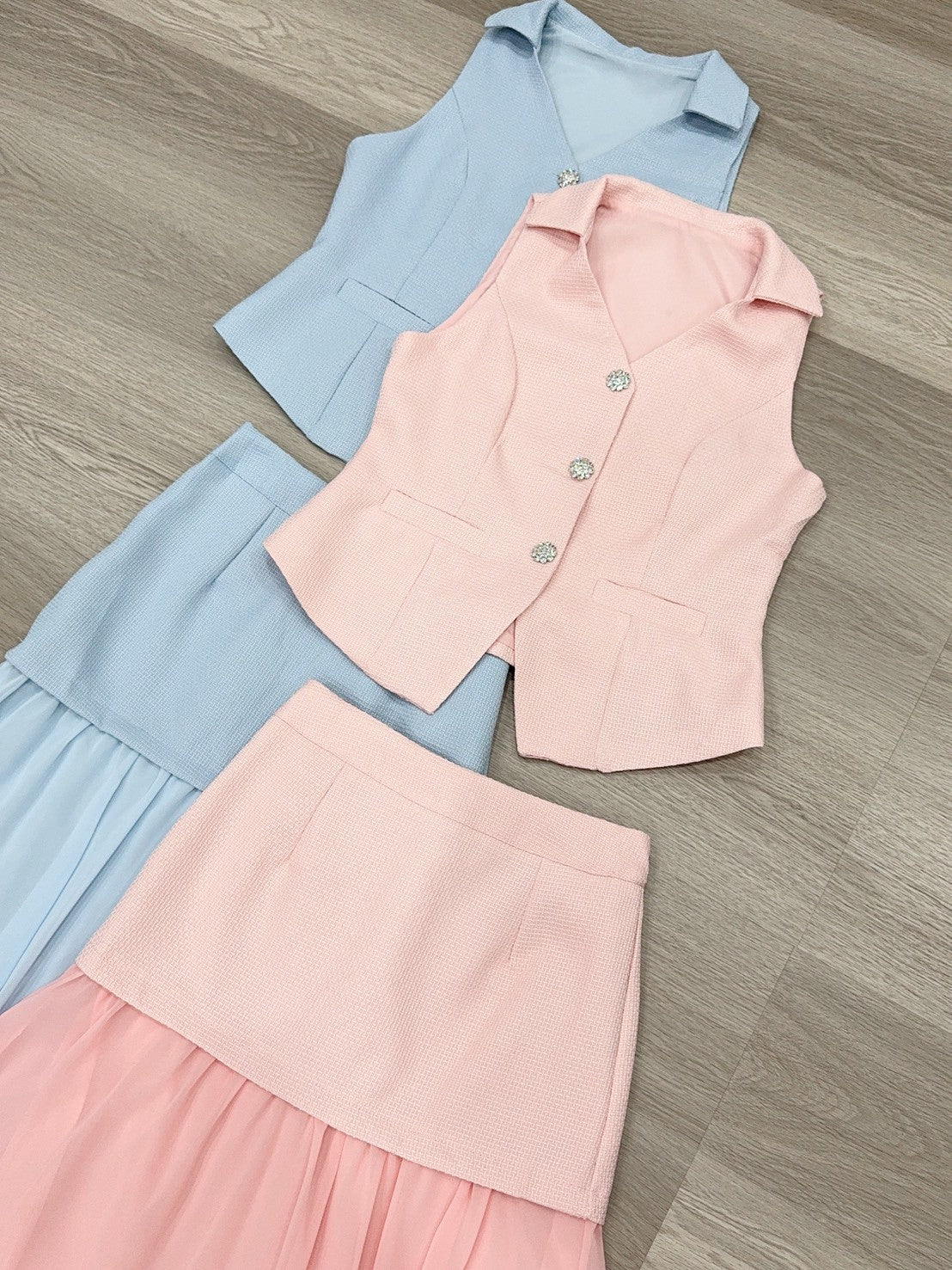 Features: Set tweed premium dengan tekstur halus dan furing yang nyaman. Top kancing hidup dan rok dengan kombinasi sleting samping serta karet belakang memberikan fit yang rapi namun tetap fleksibel.