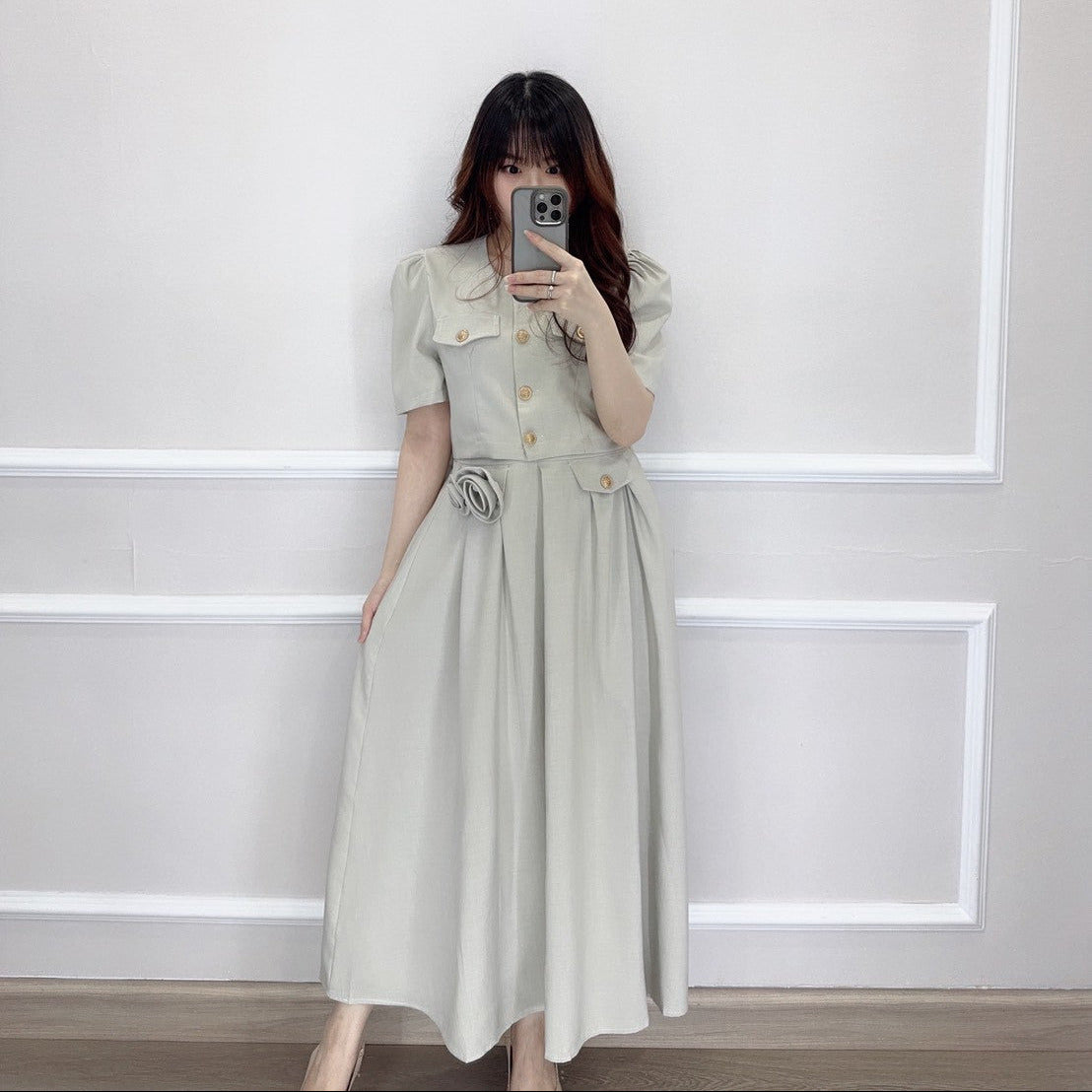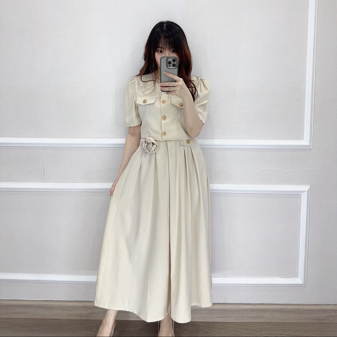 Set atasan kancing hidup dengan detail minimalis, dipadukan dengan rok A-line lebar yang nyaman dan elegan. Rok dilengkapi sleting samping serta kancing variasi.